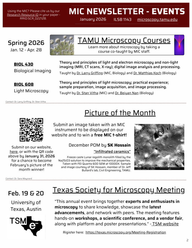 In this edition, we ask for your opinion on a potential biological image analysis working group, highlight AIVIA, an AI-enabled software for 3D image segmentation, and list two TAMU microscopy courses co-taught by MIC staff that only happen in the spring.
