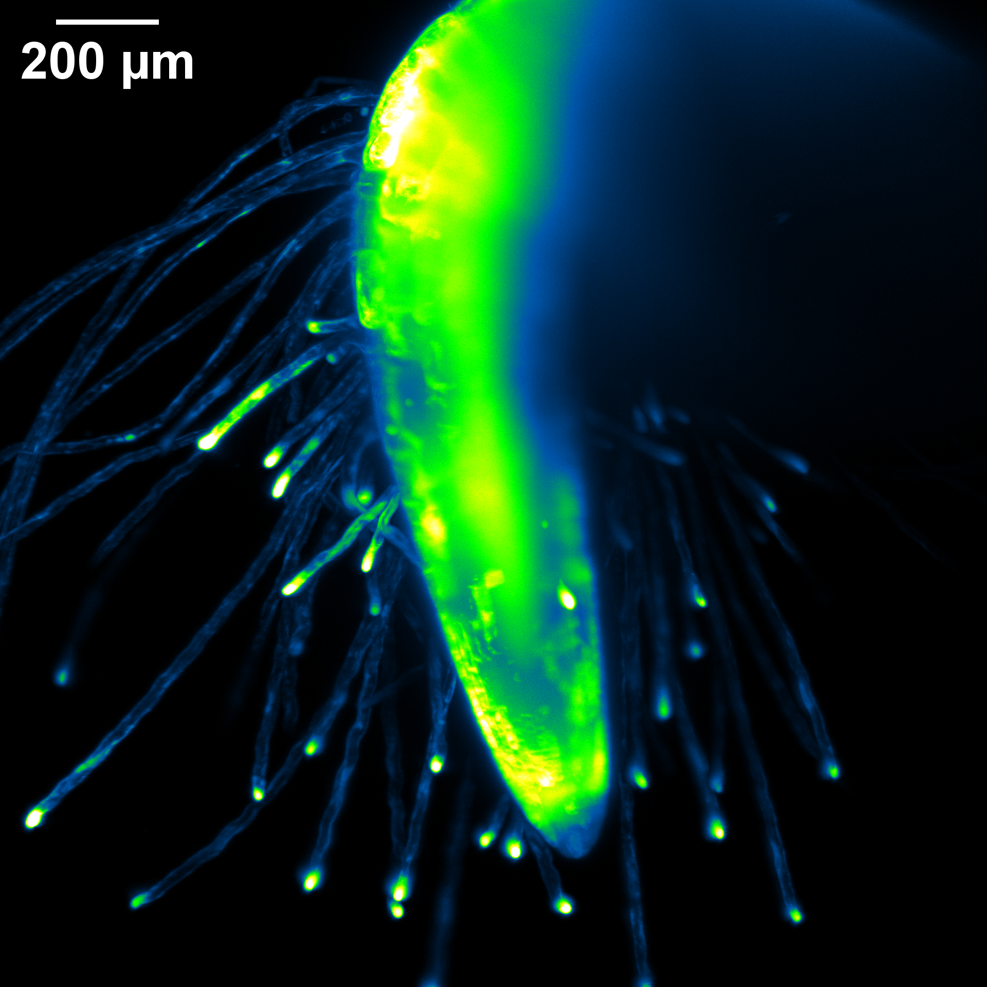 The root of a 2-day-old Arabidopsis seedling expressing fluorescent cytosolic calcium sensor GCaMP. The sample was grown in FEP tubing and imaged on the Zeiss Light Sheet with the 20X immersion lens. Sample courtesy of Kaitlin Hill and Cerrina Rodriguez. Image Courtesy of Kaitlin Hill (Griffing Lab, Biology) and Holly Gibbs.